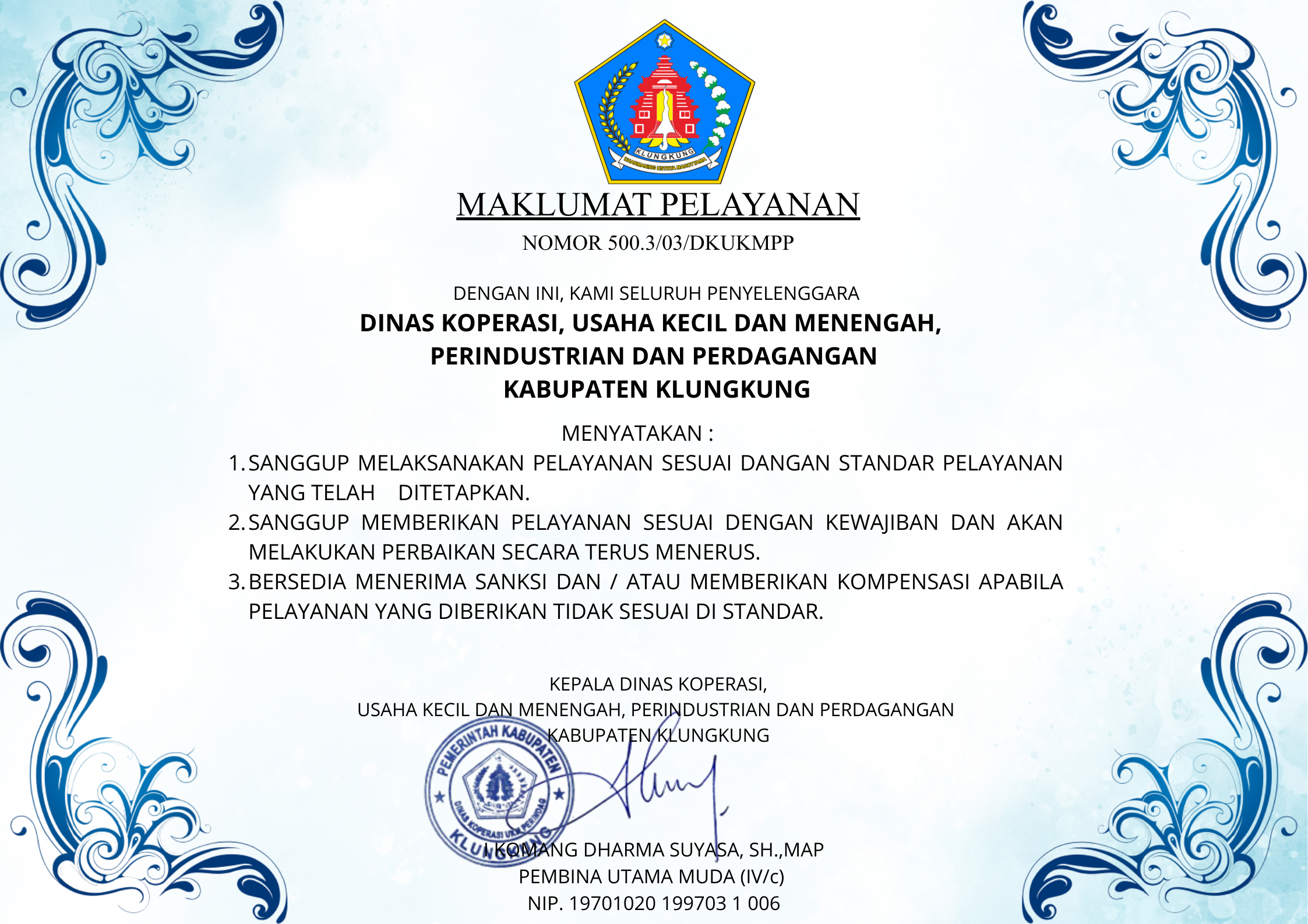 Maklumat Pelayanan Dalam rangka meningkatkan kualitas pelayanan kepada masyarakat, Dinas Koperasi UKM Perindustrian dan Perdagangan Kabupaten Klungkung menegaskan komitmennya melalui Maklumat Pelayanan sebagai bentuk kesungguhan dalam memberikan layanan yang cepat, tepat, transparan, dan akuntabel. Maklumat Pelayanan ini menjadi wujud tanggung jawab kami untuk terus menjaga profesionalisme serta meningkatkan mutu layanan di bidang koperasi, UMKM, perindustrian, … Baca Selengkapnya