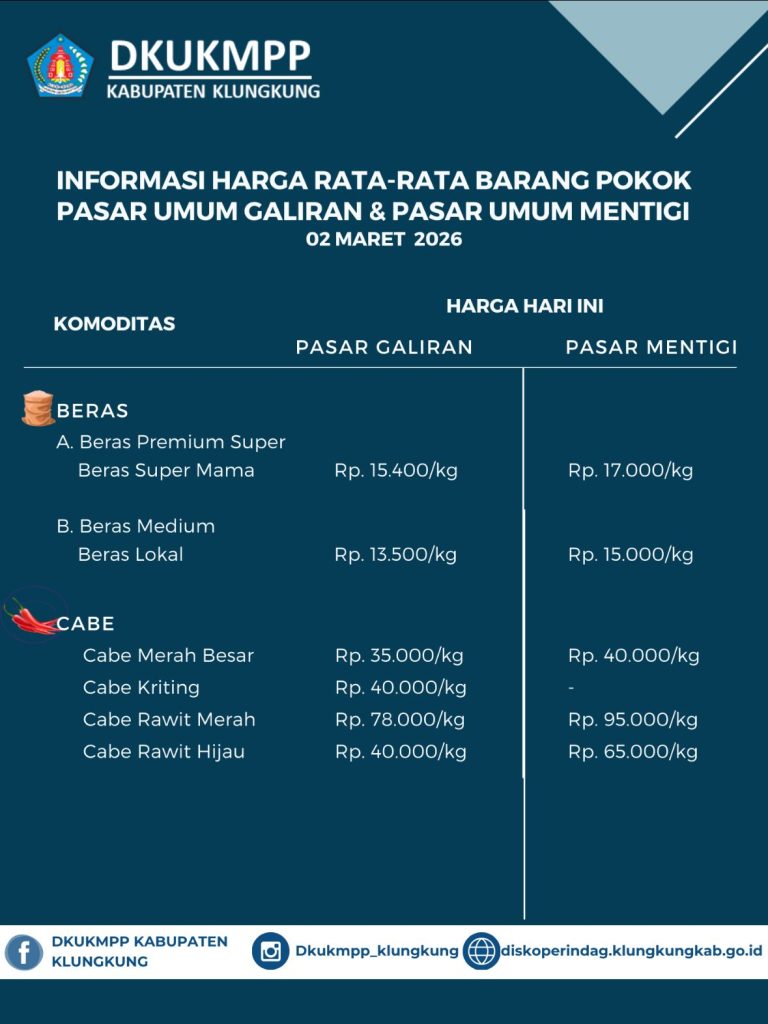 Informasi Harga Rata-Rata Barang Pokok Pasar Umum Galiran dan Pasar Umum Mentigi 02 Maret 2026