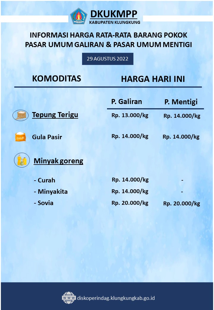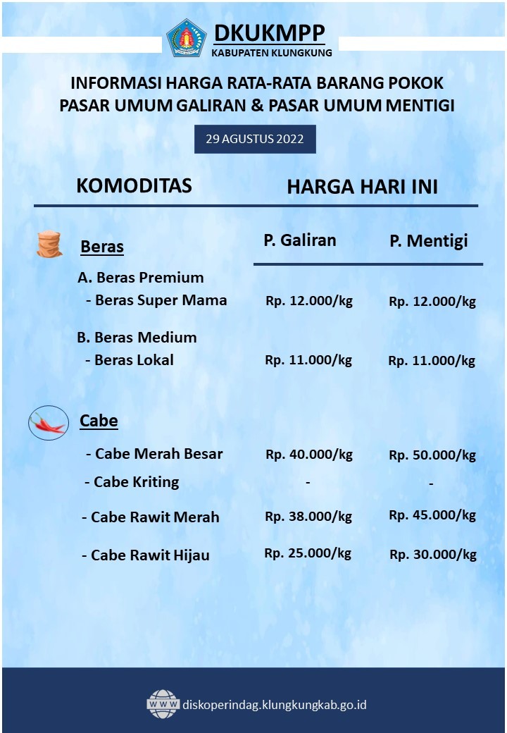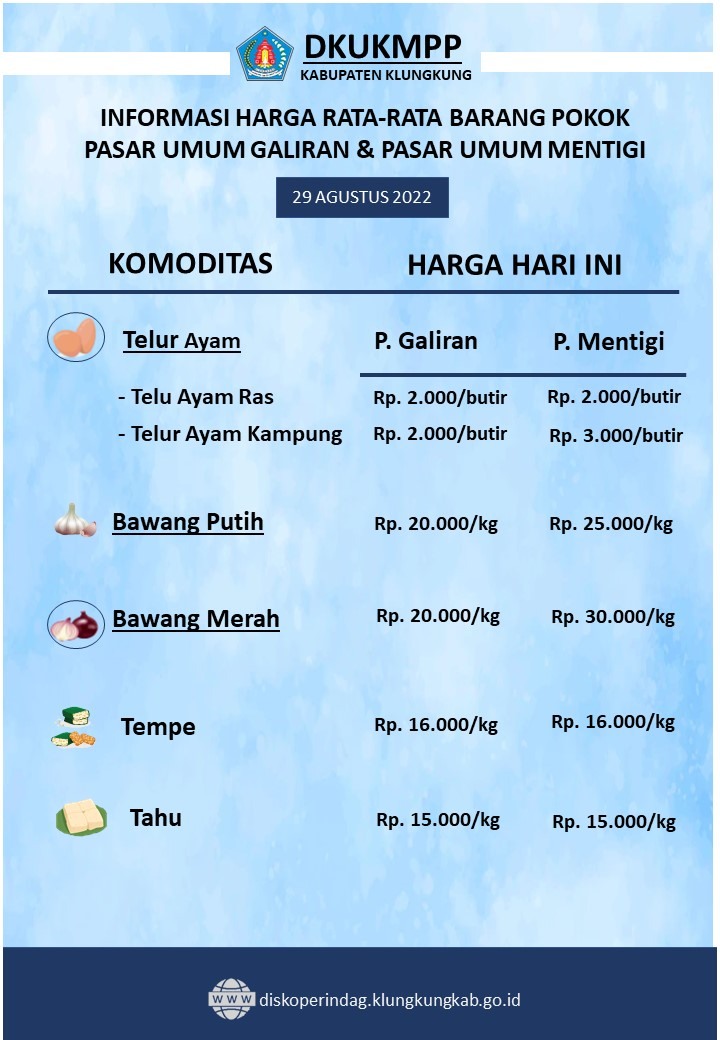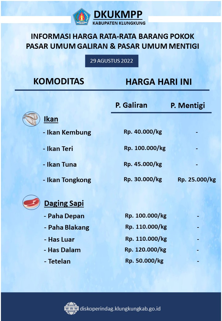 INFORMASI HARGA RATA-RATA BARANG POKOK PASAR UMUM GALIRAN DAN PASAR UMUM MENTIGI 29 AGUSTUS 2022 30/08/2022 oleh Editor